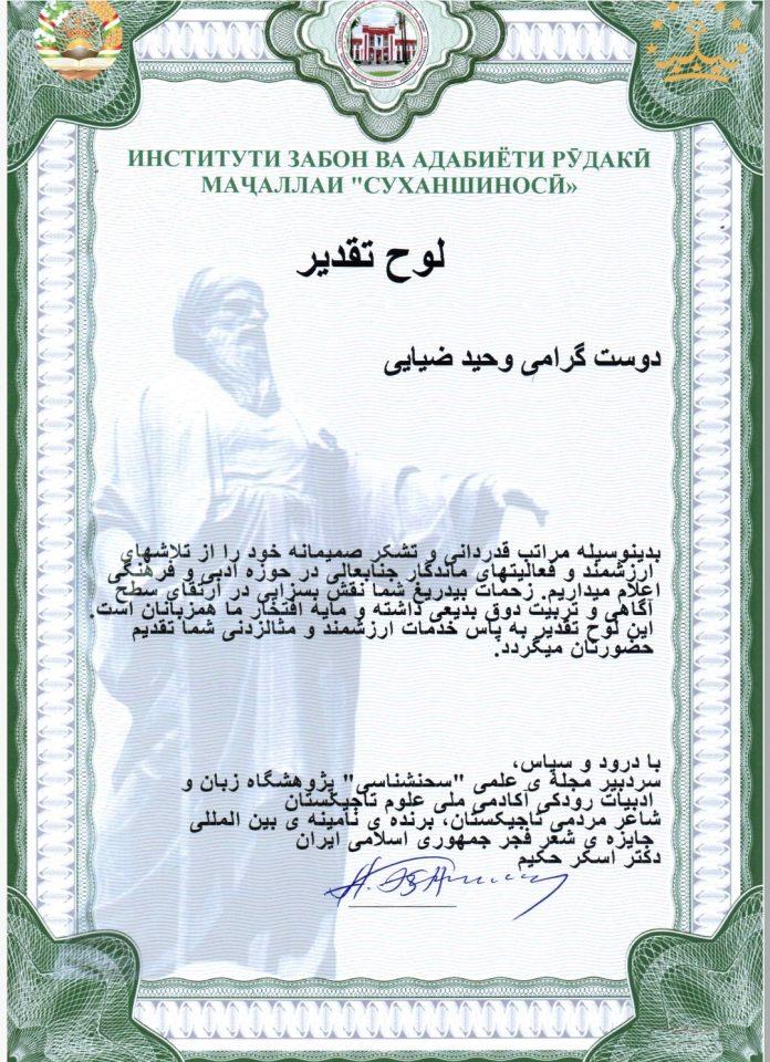 ۱. پروفسور دکتر اسکر حکیم اف رئیس اسبق اتحادیه نویسندگان تاجیکستان ، شاعر ملی و از اساتید نام آشنای ادبیات بوده عضو پیوسته آکادمی علوم نیز هستند . طی سال‌های اخیر مراودات ادبی ما ، بخصوص بحث آموزش خلاقانه نویسندگی و بخصوص شعر _ این میراث مشترک ما _ دغدغه فرهنگی ما و بسیاری از این دوستان در جغرافیای فرهنگی بزرگ مان بوده است . از هند تا بخارا ، از غزنه تا استامبول … ادبیات زبان مشترک ماست . سپاسگزارم از اساتید و اعضای فرهیخته ی آکادمی علوم و ادیبان فرهیخته ی تاجیک.